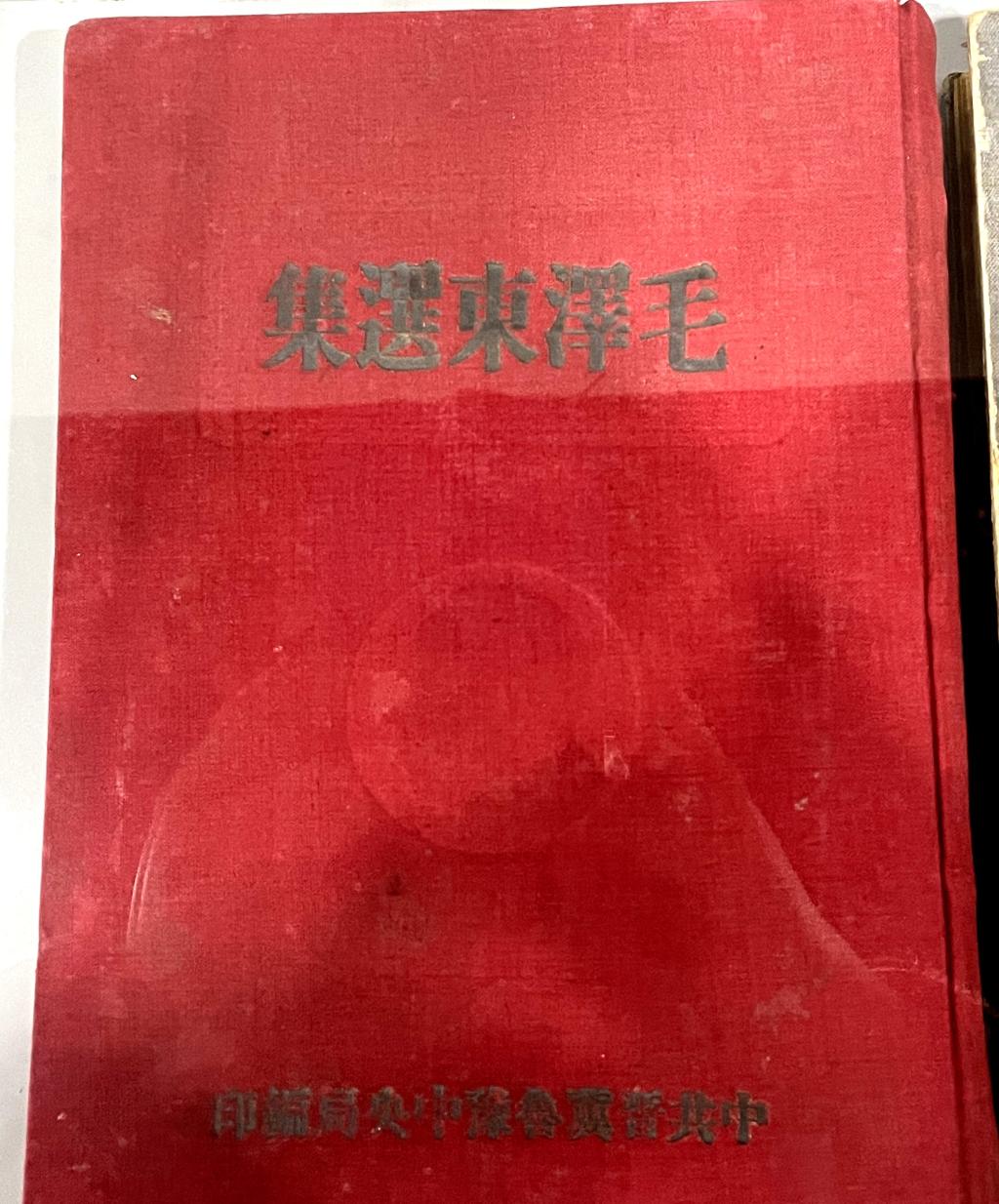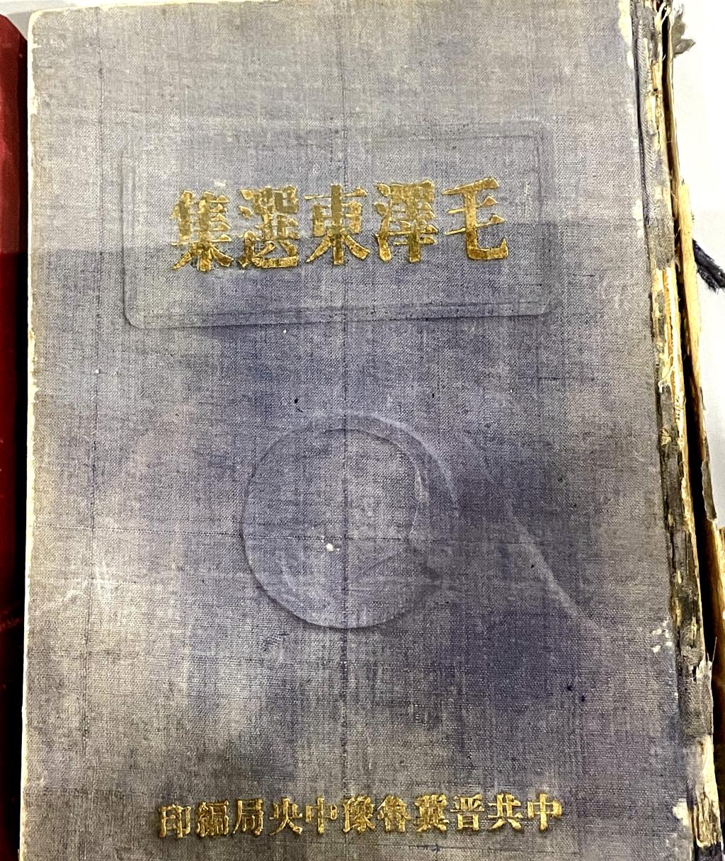 本展室收藏的《毛泽东选集》分为上、下两卷,十六开本,蓝、红色布面精装。封面中央为毛泽东头像,上面的“毛泽东选集”和下面的“中共晋冀鲁豫中央局编印”为烫金字。这套《毛泽东选集》的珍贵之处在于当时为内部发行,供高级干部学习使用。本品为1948年出版印制,这套书印量不多,加之经过70多年的沧桑巨变,存世量很少,已成为十分珍贵的革命文献。
