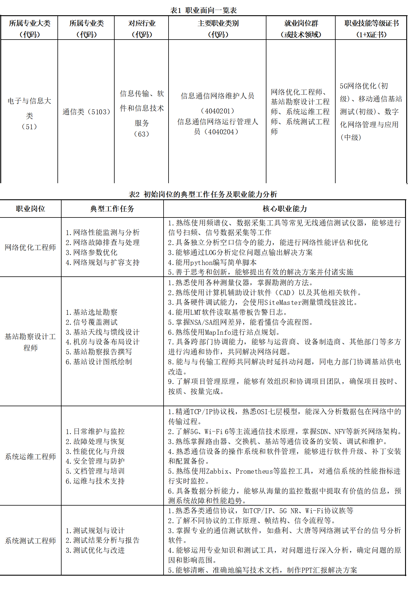 为适应5G及未来6G通信技术、物联网、人工智能、大数据等新兴技术领域带来的新变化,顺应全球通信行业向智能化、融合化、绿色化发展的新趋势,对接新产业、新业态、新模式下移动通信网络规划与优化工程师、5G基站建设与维护工程师、通信设备调试与测试工程师、等岗位的新要求,不断满足通信行业高质量发展对高素质技能人才的需求,推动职业教育专业升级和数字化改造,提高人才培养质量。